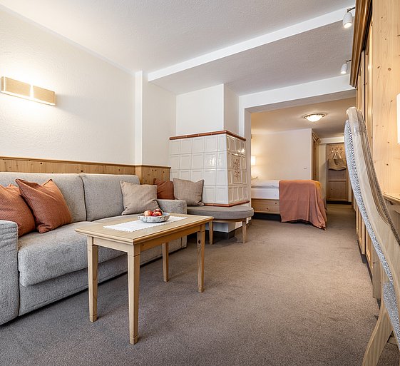 Schönes Wohnen im alpinen Stil – mit gemütlichem Wohnteil und Kachelofen samt Ofenbank, die im Winter zum absoluten Lieblingsplatz wird.